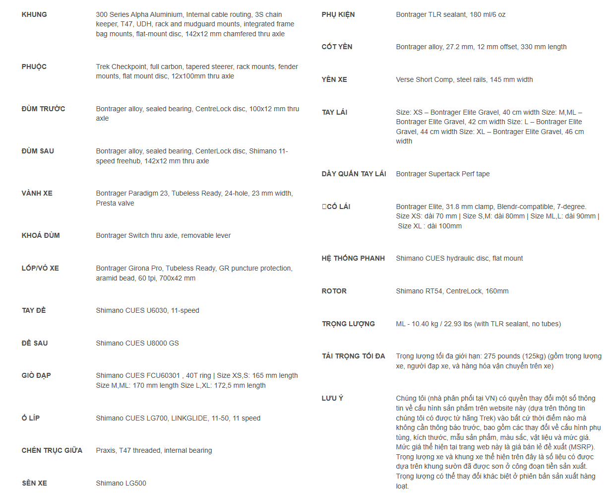 Checkpoint ALR 4 là mẫu xe gravel bằng nhôm hoàn hảo để bạn bắt đầu hành trình khám phá những cung đường ít dấu chân người. Thiết kế hình học bền bỉ (endurance geometry) hiện đại giúp bạn luôn thoải mái khi băng qua đường sỏi hay ổ gà, cùng khoảng trống khung cho lốp lên tới 50 mm cho phép lắp lốp lớn để tăng độ bám đường. Xe được trang bị phuộc carbon, bánh xe Bontrager Paradigm, bộ truyền động Shimano CUES 8000 11 tốc độ, phanh đĩa thủy lực và hàng loạt điểm gắn túi cũng như phụ kiện.