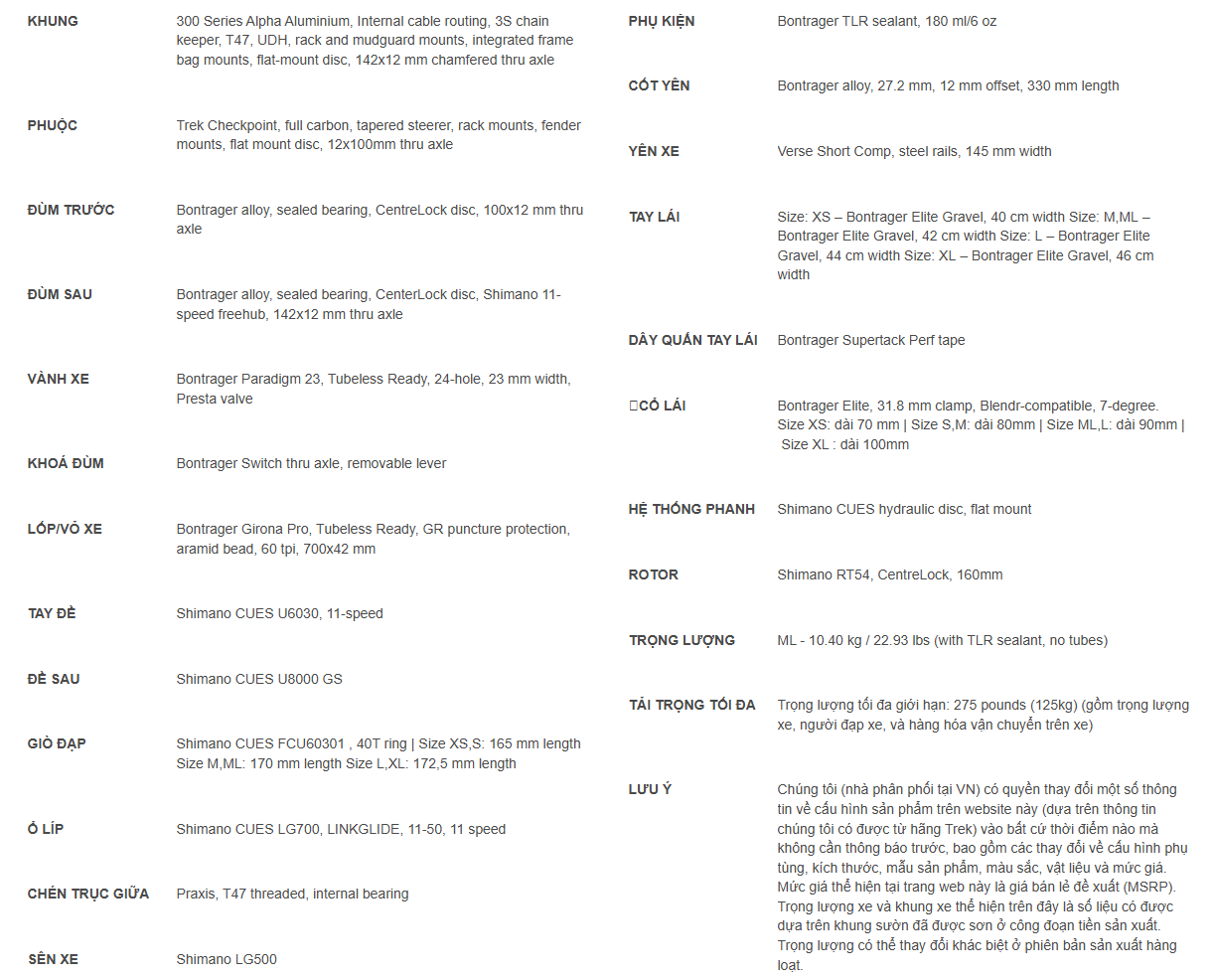 Checkpoint ALR 4 là mẫu xe gravel bằng nhôm hoàn hảo để bạn bắt đầu hành trình khám phá những cung đường ít dấu chân người. Thiết kế hình học bền bỉ (endurance geometry) hiện đại giúp bạn luôn thoải mái khi băng qua đường sỏi hay ổ gà, cùng khoảng trống khung cho lốp lên tới 50 mm cho phép lắp lốp lớn để tăng độ bám đường. Xe được trang bị phuộc carbon, bánh xe Bontrager Paradigm, bộ truyền động Shimano CUES 8000 11 tốc độ, phanh đĩa thủy lực và hàng loạt điểm gắn túi cũng như phụ kiện.