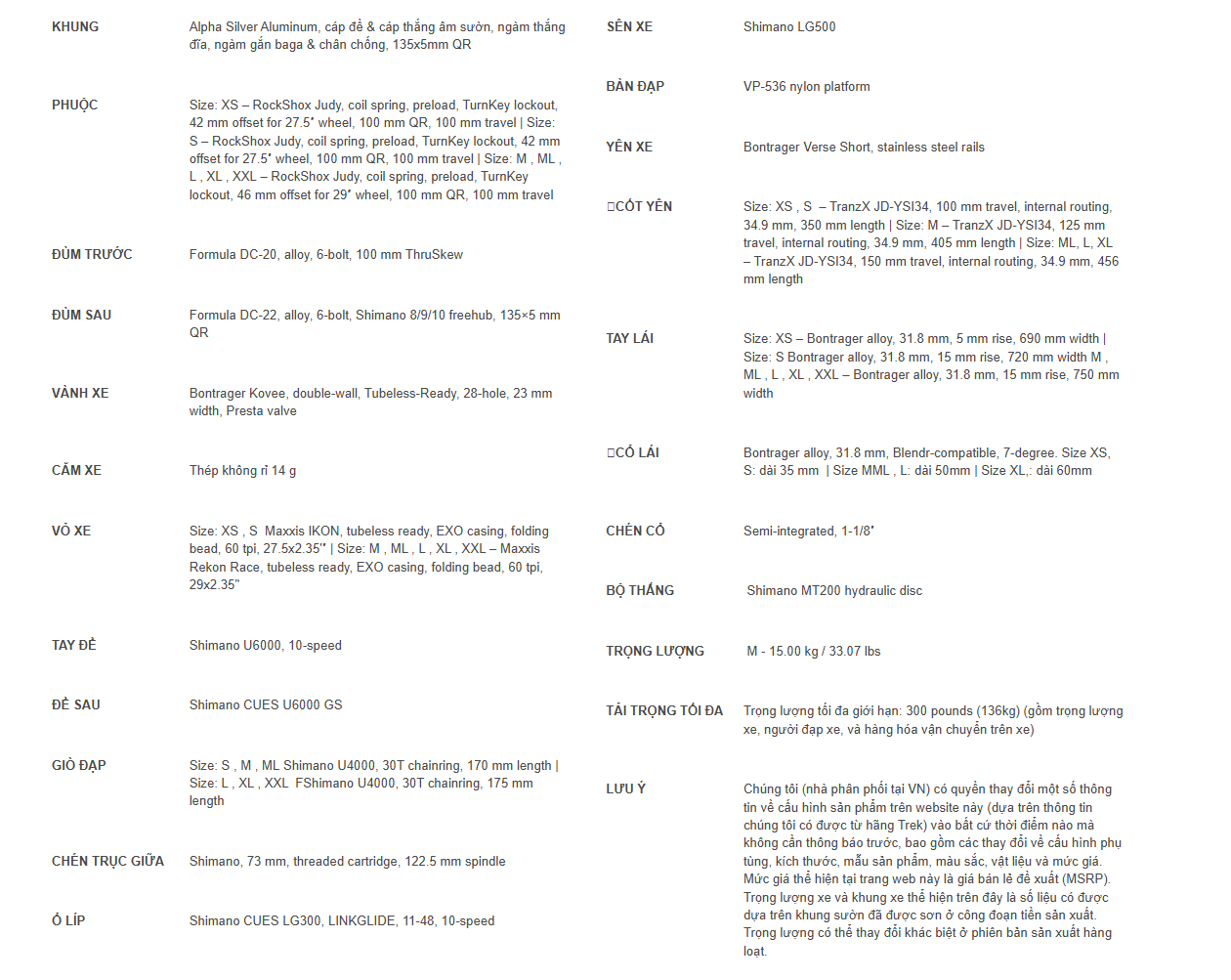 Kích cỡ XS, S: RockShox Judy – lò xo cơ học, chỉnh độ nén, khóa hành trình TurnKey, offset 42 mm cho bánh 27.5", hành trình 100 mm, trục nhanh 100 mm. Kích cỡ M – XXL: RockShox Judy – lò xo cơ học, chỉnh độ nén, khóa hành trình TurnKey, offset 46 mm cho bánh 29", hành trình 100 mm, trục nhanh 100 mm. |