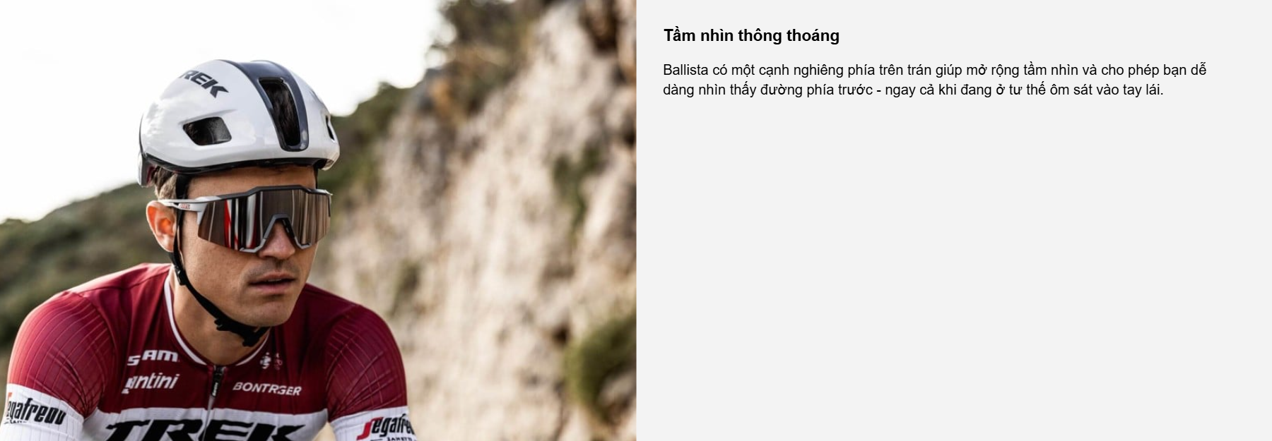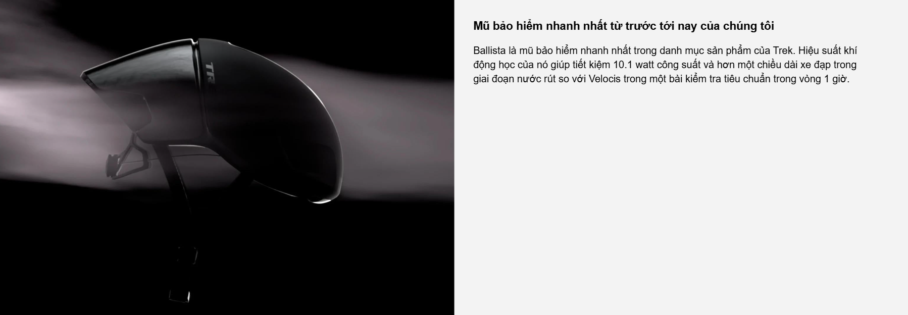 Khi tốc độ là ưu tiên hàng đầu của bạn và mỗi watt đều có giá trị, hãy tìm đến chiếc mũ bảo hiểm có thể cản gió để giúp bạn tiết kiệm được từng giây. Ballista là chiếc mũ bảo hiểm nhanh nhất, có tính khí động học tiên tiến nhất của Trek. Nhẹ, mát, thoải mái và được thiết kế với hệ thống an toàn Mips Air tích hợp đầy đủ được thiết kế để giúp bạn an toàn hơn.