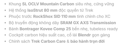 Khung: SL OCLV Mountain Carbon, tích hợp công nghệ IsoStrut, UDH, hành trình 80 mm.